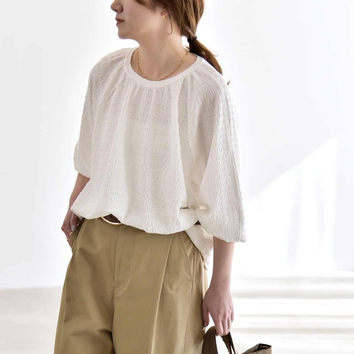 ブラウスのようにきちんと感がありながら、楽な着心地が嬉しいジャカードジャージー素材のプルオーバー。