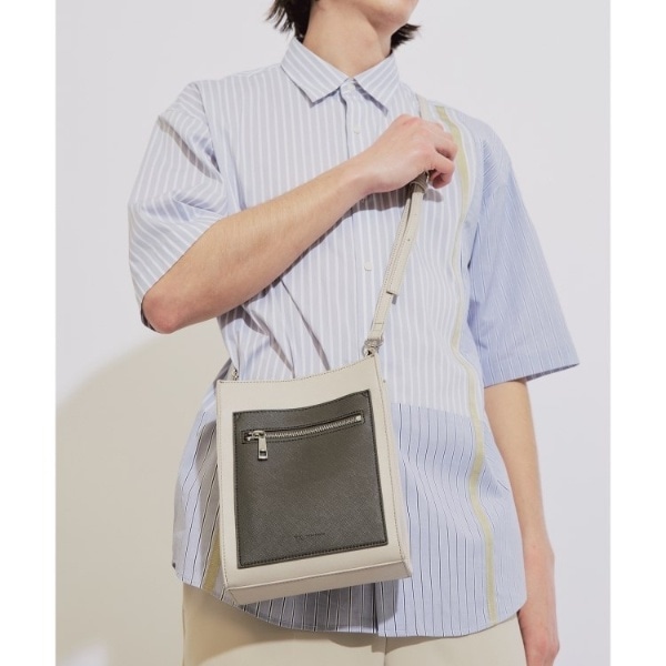 ポイントで合成皮革ポケットをあしらったコンビデザインのショルダーバッグ。