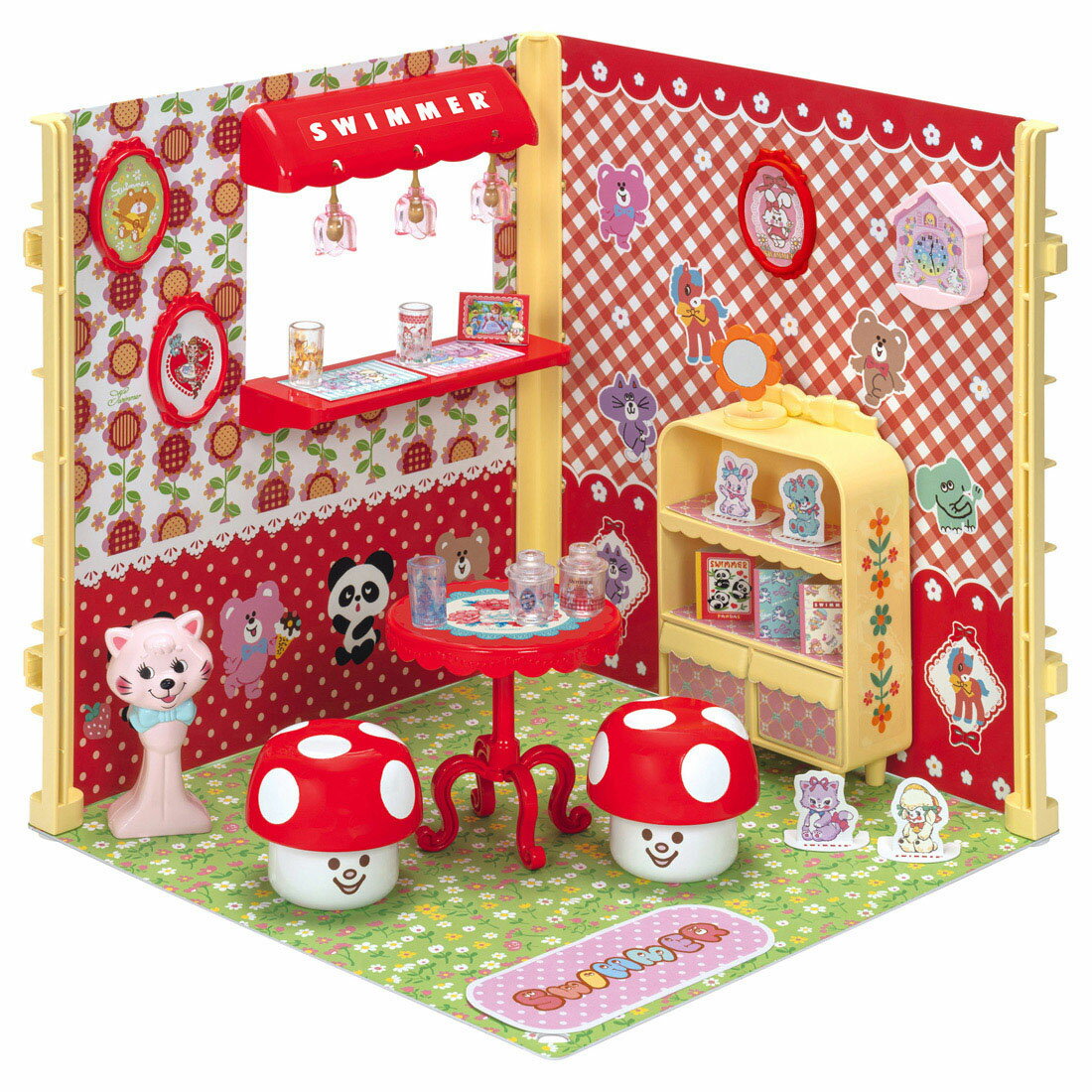 雑貨ブランド「SWIMMER」とコラボレーションした、リカちゃんの世界観でインテリアコーディネートを楽しめるアイテムが登場!SWIMMERのかわいい雑貨を、リカちゃんサイズでぎゅっと再現!グラスやキャニスター、フラワーミラー、シャポードールなど、SWIMMERならではのキュートなアイテムがそろっています。SWIMMERのキャラクターでいっぱいの壁に、棚やテーブル、スツールを配置すれば、かわいいSWIMMERに囲まれた夢のお部屋が完成。リカちゃんのおへやあそびが、もっと楽しく、もっとかわいく広がります。セット内容床シート(1),壁シート(2),柱パーツ(3),柱とめパーツ(3),シェルフ(ひきだしx2個付き)(1),きのこスツール(2),カウンタールーフ(1),カウンターテーブル(1),ペンダントライト(電球パーツ付き)(3),かべかけ時計(1),アートフレーム(3),グラス(3),キャニスター(ふたつき)(2),フラワーミラー(1),シャポードール(1),かみこものシート(1),クリアシールシート(1),シールシート(1),ジェルシールシート(1),取扱説明書(1),※人形、ドレス、一部の小物は別売りです。,【対象年齢】:3才〜