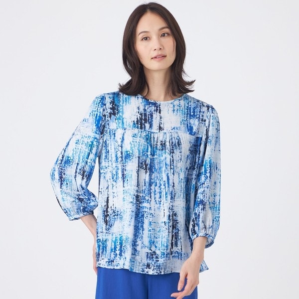 イタリアLISA社のプレミアムラインのプリントになります。アブストラクトな掠れ調のプリントは水しぶきのようにも見えるとてもオリジナリティのあるプリントに仕上がっています。デニムライクな掠れとも相性がいいです。生地はピーチサテンを使用し薄いながらにパウダリー感があるのでシーズン通して使える、ポリエステル素材なのでシワにもなりにくい手洗い可能な素材です。