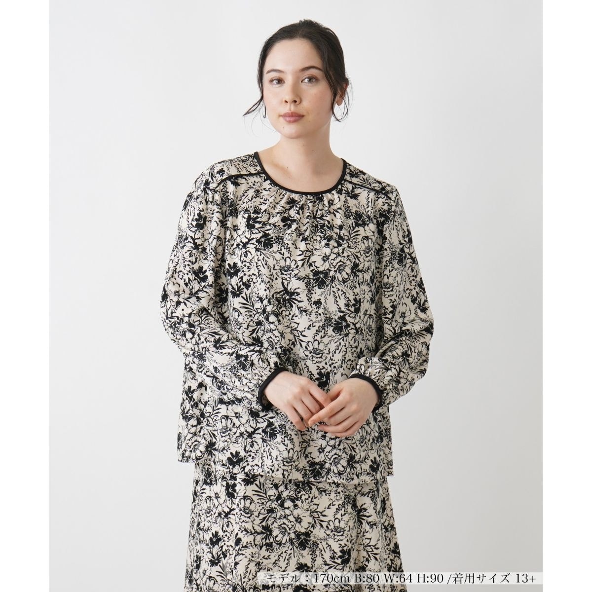 繊細なフラワー柄が印象的にプリントされたクルーネックブラウス。ネックラインはすっきりと開いており、デコルテを美しく際立たせながら、程よい抜け感を演出。袖にはふんわりとしたボリュームをもたせ、エレガントさとリラックス感が絶妙に調和。肩の力を抜いて楽しめる快適な着心地を実現しました。バックネックの涙あきはループボタンにより開閉が可能。お揃いの柄のスカートを合わせてセットアップ風にコーディネートするのもおすすめです。