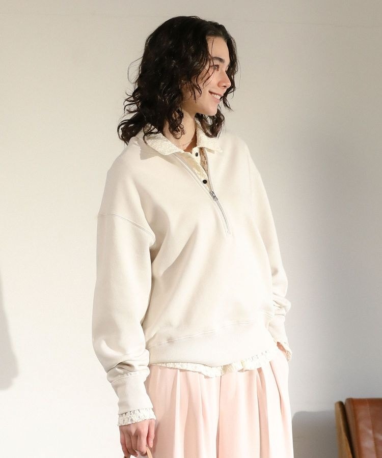 首元ジップで印象自在、毎日に寄り添う一枚やわらかな裏毛素材を使用し、ほどよい厚みで快適な着心地を叶えてくれます。ハーフジップ仕様がデザインのポイントになり、閉じれば落ち着いた印象に、開ければ首元がすっきりとして抜け感のある着こなしが楽しめます。インナーを合わせたレイヤードスタイルもしやすく、季節に応じたコーディネートが可能です。シンプルなシルエットは体のラインを拾いにくく、自然に体型をカバーしてくれます。デニムやきれいめパンツ、スカートとも相性が良く、日常使いからちょっとした外出まで幅広く活躍します。着回し力が高く、長く愛用できる一枚です。透け感[なし]