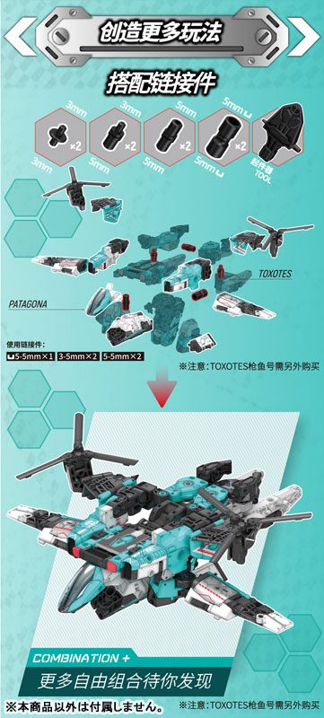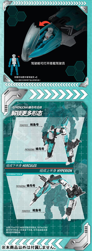単体での可変ギミックに加え、同シリーズの「トクソテス」(別売り)などと合体することで、複数の形態を構築できる拡張性の高いモデルです。