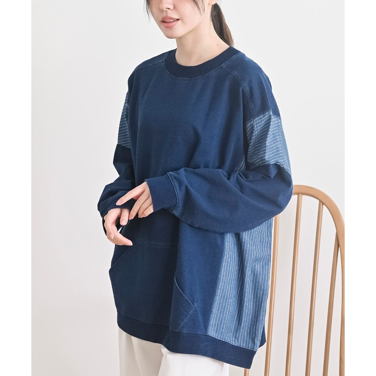 インディゴ裏毛布帛切替ジップパーカー