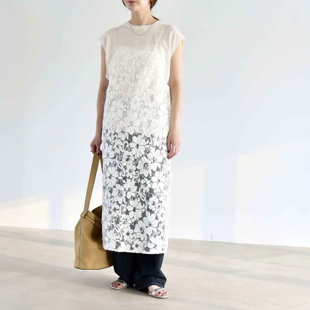 quaranciel:〈手洗い可能〉フラワー レース ストレッチ クルーネック プルオーバー