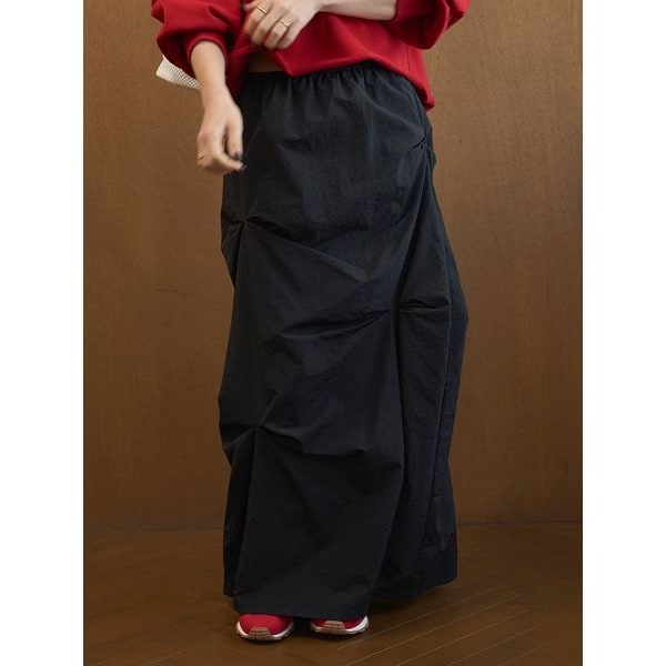タックデザインを効かせたemmi定番のナイロンスカートはウエストゴム仕様なのでイージーに着られて普段使いにもおすすめ。