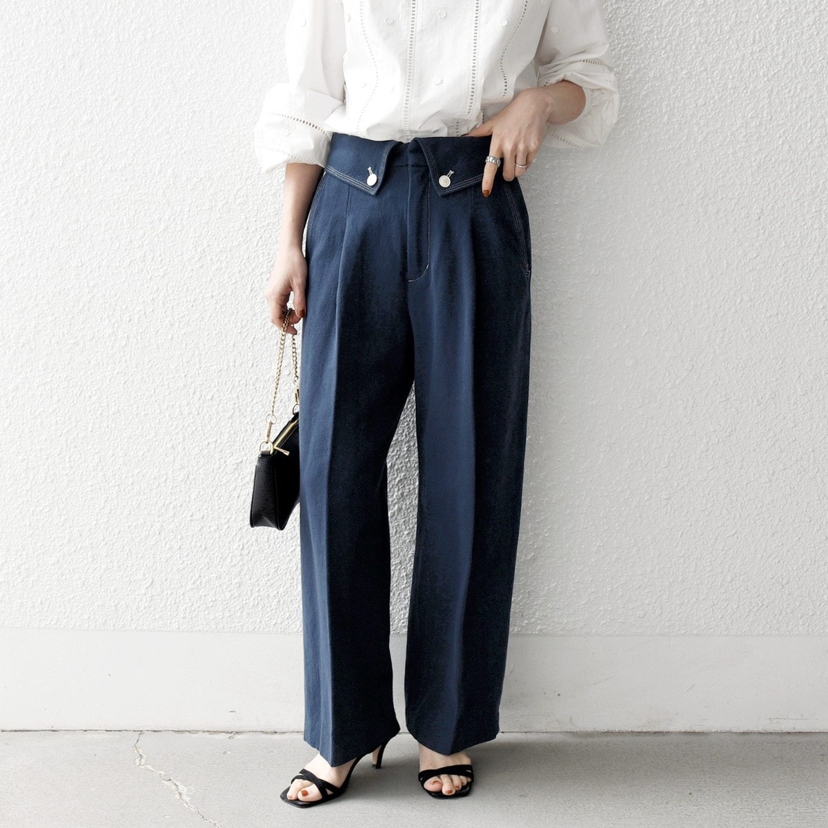 ウエストの折り返しデザインが目を引く、セミワイドパンツ。