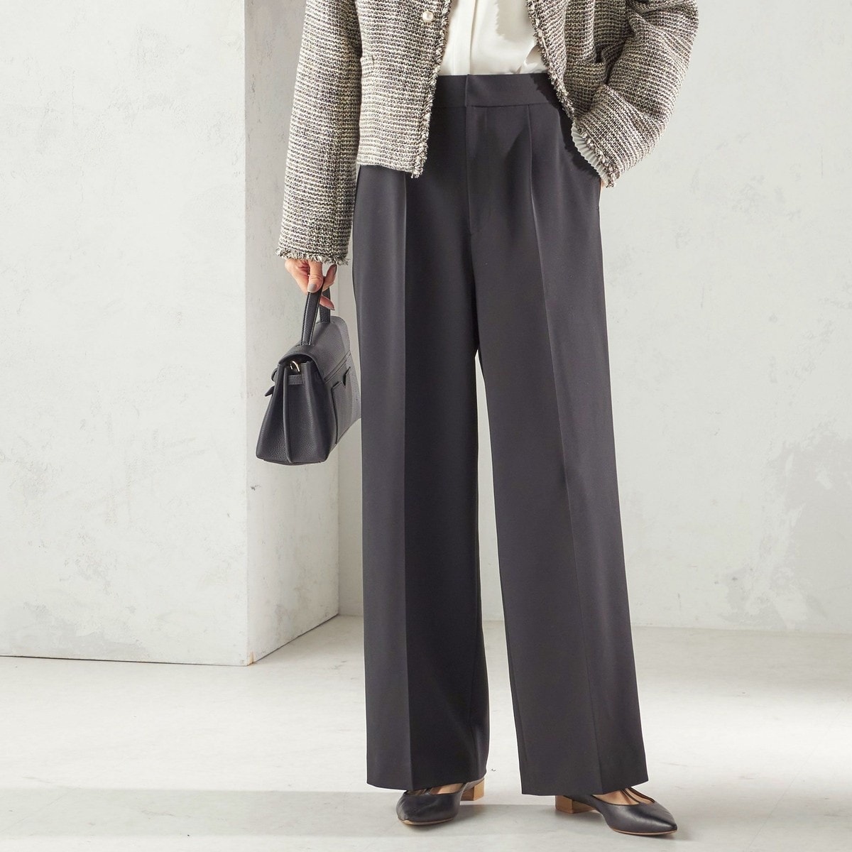 ツイード素材のジレやジャケットとも相性が良い万能なデザインなので、お手持ちのトップスに合わせて幅広くご活用いただけます。