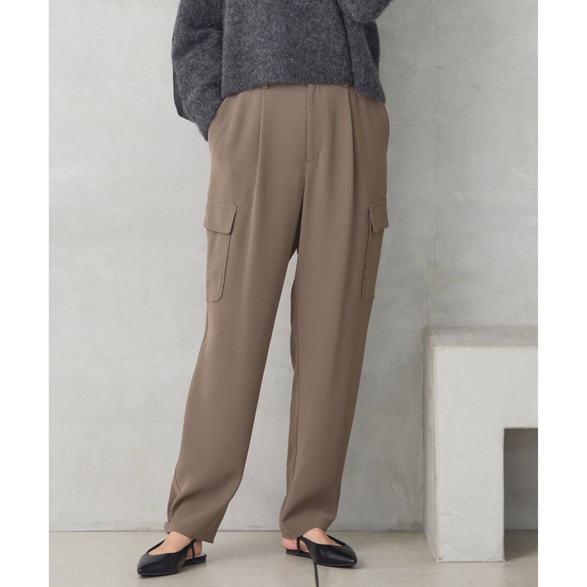 大人のカジュアルコーデに取り入れたいカーゴパンツ■デザインウエストにゴムギャザーを寄せた1タックのカーゴパンツです。ヒップから太もも辺りまではややゆとりがあり、裾に向かって緩くテーパーを付けたシルエットで、脚のラインを美しく見せつつ程よい抜け感を感じられます。裾部分はタブベルトとドット釦で絞ることができるので、コーディネートに合わせてシルエットを変えて着て頂けます。サイドのアウトポケットもアクセントになります。カジュアルな素材ではなく、程よくエレガントな素材にすることで、大人っぽいカジュアルパンツに仕上げました。■素材ポリエステルの特殊加工糸を組み合わせた収縮性のある2WAYストレッチ素材です。二重織組織にしているため膨らみ感がありますが、軽さと適度な落ち感と反発性、さらさらとした柔らかい手触りが特徴です。