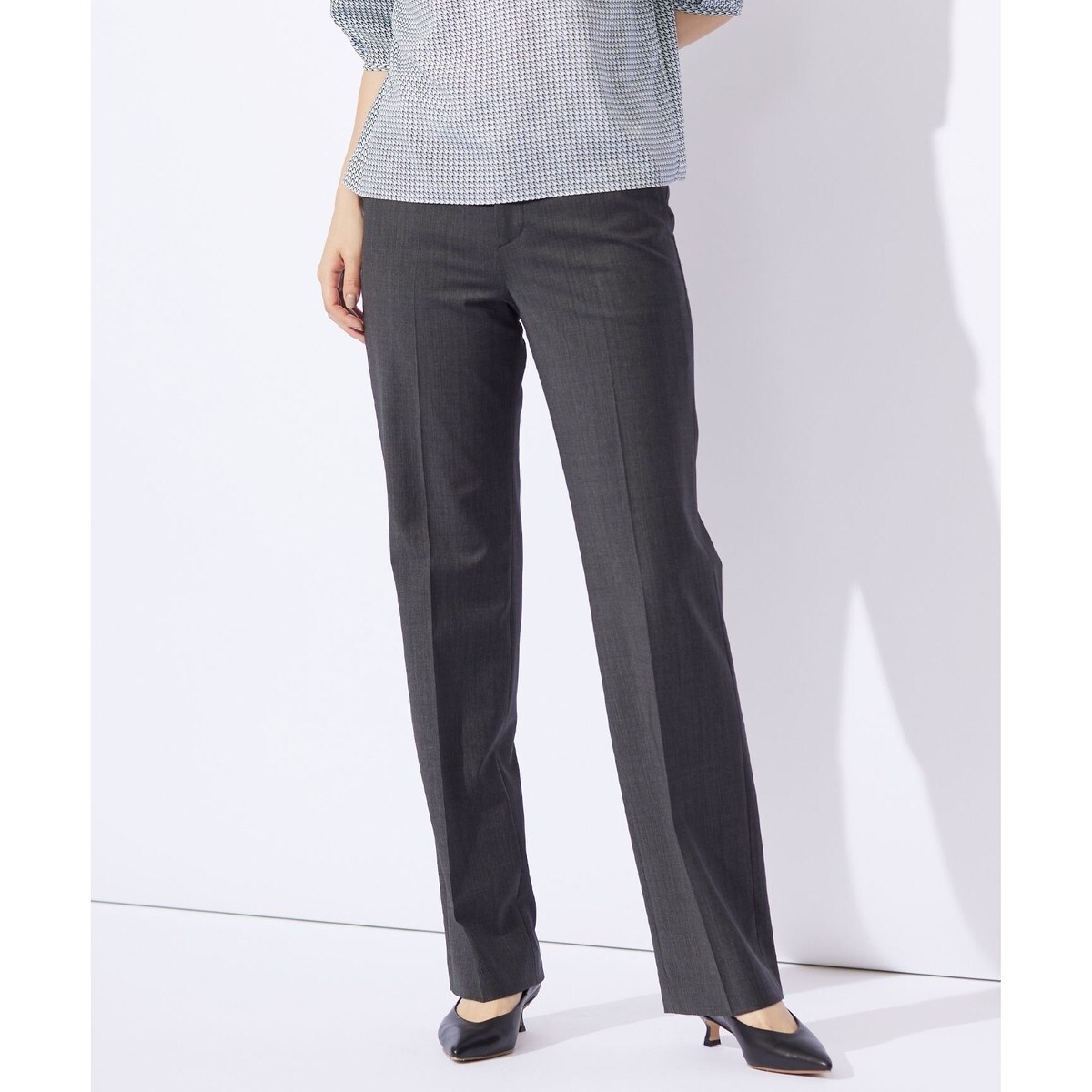 着用した際によりきれいに見えるようにシルエットにこだわった、ストレートパンツ。柄は、一見無地のように見える点模様のピンヘッド柄で、光の当たり方や角度によって色味が変わるため表情の変化をお楽しみいただけます。同素材のジャケットとセットアップもおすすめ。仕立ては膝下20cmです。カラーは、落ち着きときちんと感を兼ね備えたグレー(#004)の1色で展開します。