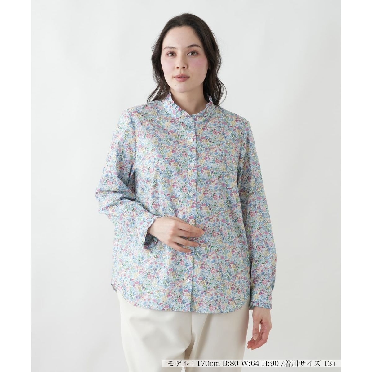 ピンクとブルーの美しい色彩が織りなす、華やかな花柄のスタンドカラーブラウスです。春の陽射しに映えるフェミニンなデザインは、一枚で着こなしの主役になります。顔周りをすっきりと見せるスタンドカラーが上品な印象を与え、ジャケットやカーディガンのインナーとしても存在感を発揮します。心躍る季節にぴったりの、エレガントな一枚です。