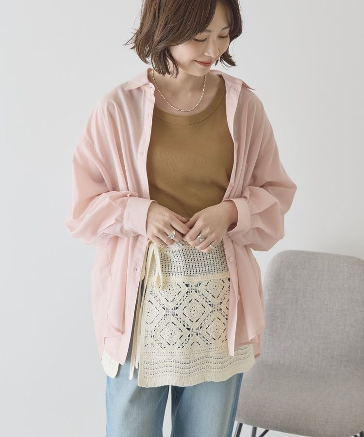 透け感でつくる、大人のやさしい抜け感軽やかなシアー素材が、装いをやさしく彩ってくれる一枚です。程よい透け感が重たく見えがちなコーディネートに抜けをつくり、自然と洗練された印象に導きます。ラウンドシルエットの裾は動くたびに柔らかな表情を生み、体のラインをさりげなくカバーします。レイヤードしやすいデザインなので、タンクトップやカットソーとの組み合わせも楽しめます。カジュアルな日常使いからきれいめなスタイルまで幅広く対応し、着回し力の高さも魅力です。毎日のコーディネートに取り入れやすく、長く愛用できる一枚です。