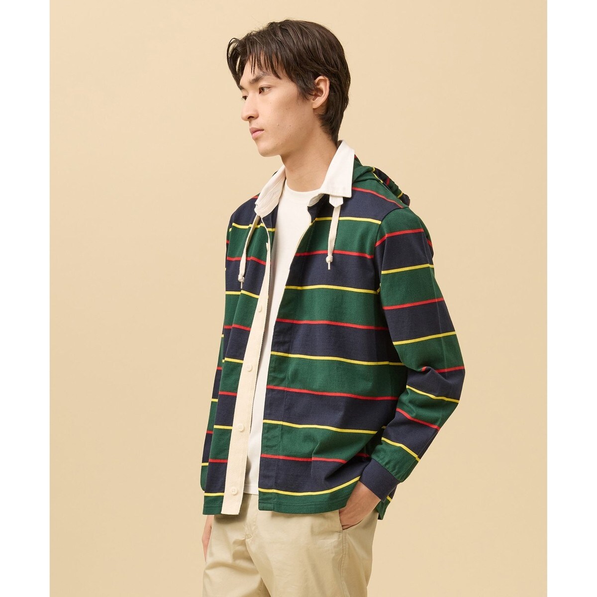 ■仕様ラガーシャツをベースに、前開きフロント仕様へアレンジ。さらに取り外し可能なフードをプラスすることで、スポーティーさと大人のカジュアル感を両立したデザインに仕上げました。