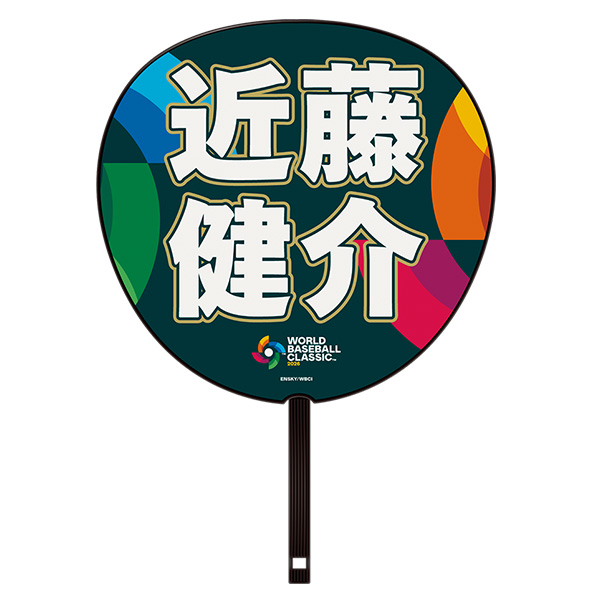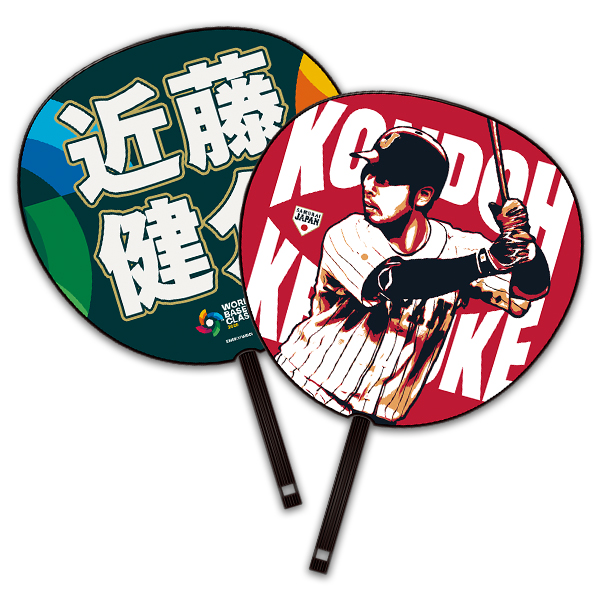 うちわの表面には迫力満点の選手イラストを配し、裏面には選手の名前を大きくデザインしました。