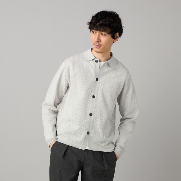 ボディは昭和レトロを思わせるモダンな透かし柄で、襟と前立ては型崩れしにくい総針の編み地で仕上げています。