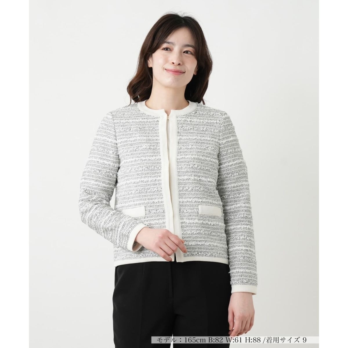 繊細なラメが織り込まれたツイード調のニットカーディガン。これからの季節の日差しに映える柔らかな輝きが顔周りを上品に彩ります。フロントに配されたループボタンや、アクセントとなる飾りポケットがクラシカルな雰囲気を演出。伸縮性に優れた軽やかな質感の生地は、さらりと羽織れる心地よさが魅力です。程よい透け感が装いに抜け感を与え、いつものスタイルにプラスするだけで大人のエレガンスを添えてくれる一枚に仕上がっています。