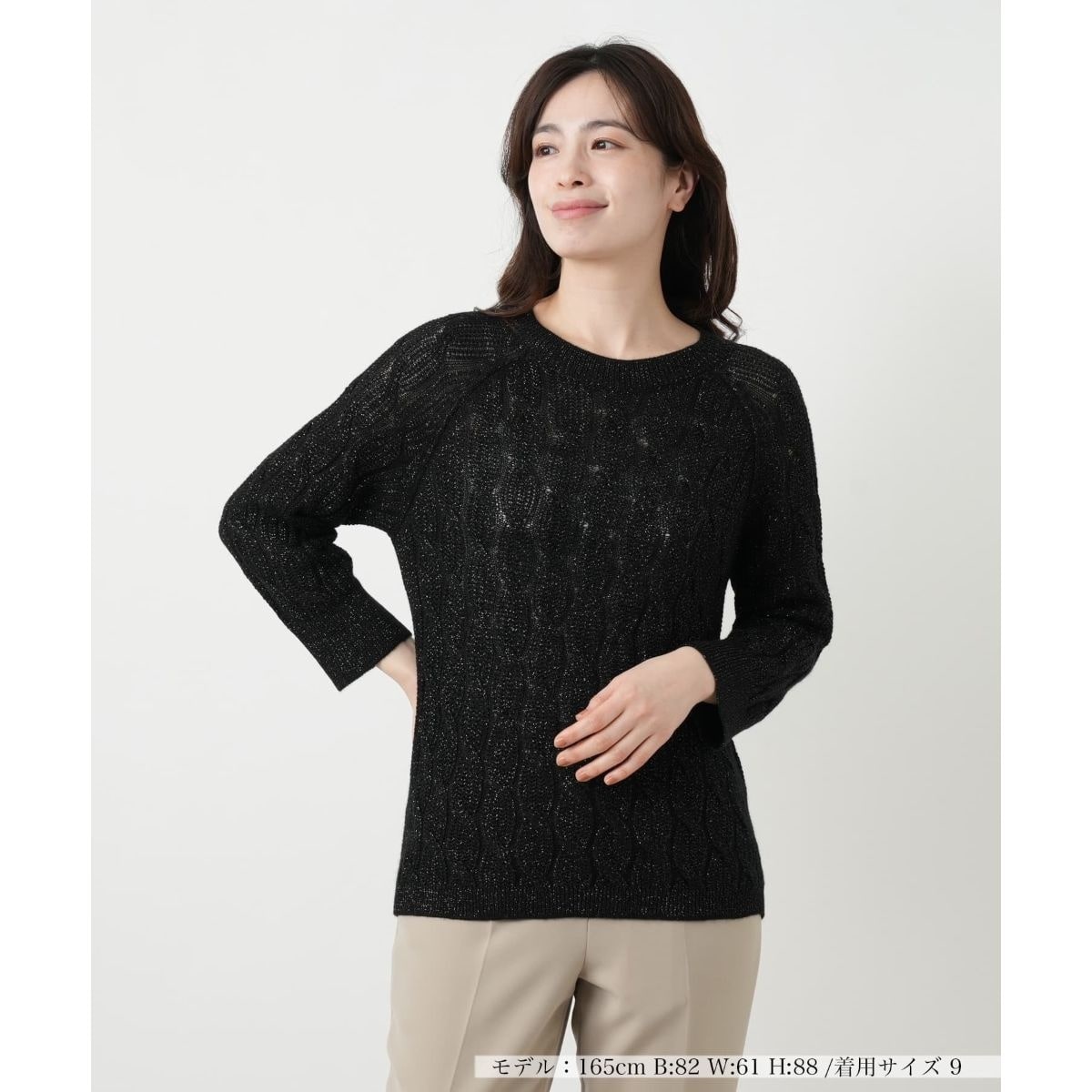 光を受けるたびに繊細なラメが煌めき、顔周りを明るく彩る「BARNA」のクルーネックニット。立体的なケーブル編みの模様が、コーディネートに豊かな表情と奥行きを演出。手首をすっきりと見せる絶妙な袖丈が、春らしい軽やかさと程よい抜け感を与えてくれます。肌馴染みの良い柔らかな質感は着心地も良く、一枚で着映えするのはもちろん、インナーとしても大人のエレガンスを品良く格上げしてくれるアイテムです。