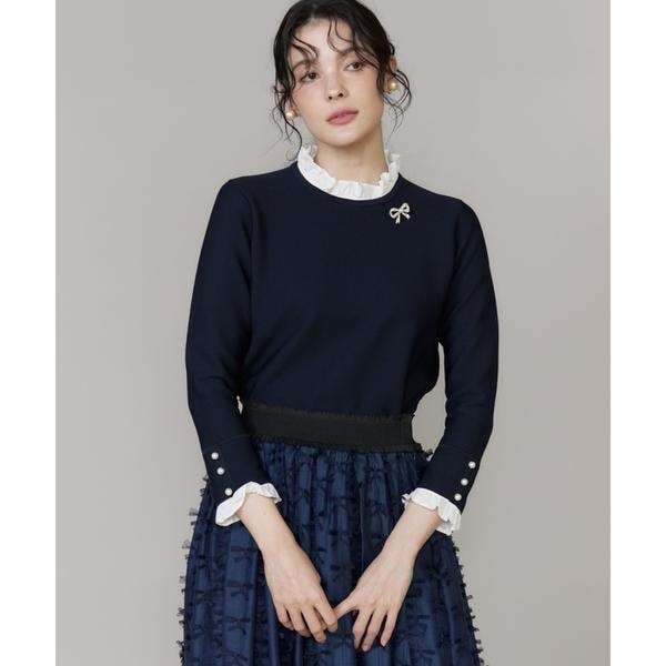 ■デザインプチハイネックがクラシカルな印象のニットプルオーバー。ブラウス生地のフリルの立体感が顔まわりや手元に華やかさを添え、着映え力も抜群です。一枚でレイヤード見えが叶うニットトップスで、程よく身体にフィットするサイジングで、ジャケットやカーディガンのインナーとしてもすっきりと着られる一枚です。■素材発色が良く、伸縮性に富んでおりスポンディッシュで柔らかく、軽量なのが特徴です。編地のパーツの段階で一度蒸気で縮める工程を経ています。そのためこれ以上縮むことがなく、水で手洗いであれば家庭洗濯が可能です。・バックボタンあり・衿フリル取り外し可・袖フリル取り外し可・水洗い可■サンプル撮影商品画像の商品はサンプルです。実際の商品とはサイズや色味、素材、デザイン等の仕様が若干変更になる場合がございます。■カラーについては、可能な限り実際の商品に近いカラーにて撮影をおこなっておりますが、照明の関係により実際の製品とは色味が違って見える場合があります。またパソコン・スマートフォンなどの環境により、若干製品と画像のカラーが異なる場合もございます。現物と画像のカラー差異については返品理由となりませんので、予めご了承ください。■サイズ表記はあくまで目安となります。