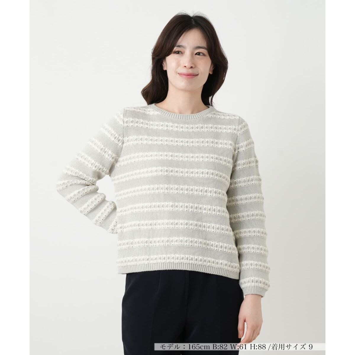 ボーダー状に切り替えられた編み地が、シルエットに豊かな表情を添えるクルーネックニットトップス。繊細な模様と程よい透け感の組み合わせが、シンプルなデザインの中に洗練された華やかさを演出します。さらりと軽やかな風合いは肌馴染みが良く、日差しが心地よい季節のコーディネートに最適。一枚で主役になるのはもちろん、インナーとしても胸元を上品に彩り、大人のデイリールックを品良く格上げしてくれるアイテムです。
