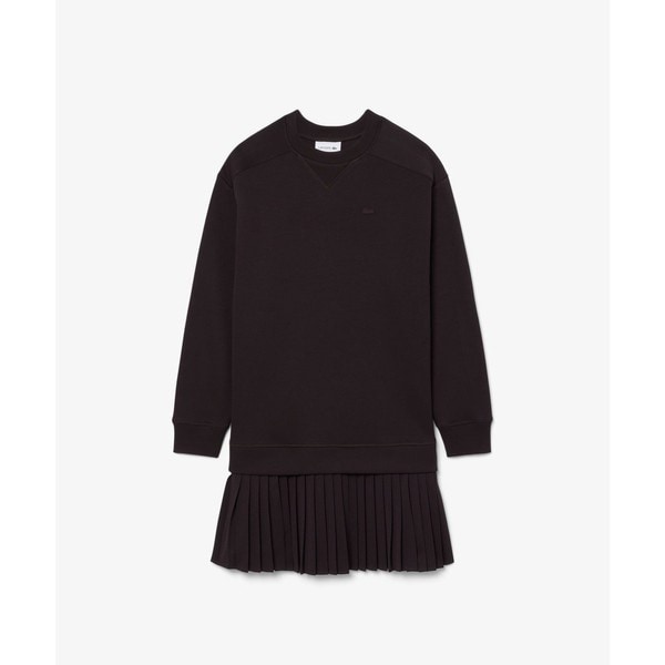 快適さとエレガンスを両立するオーバーサイズ切り替えスウェットドレス・コットン×ポリエステルのダブルフェイススウェットと、プリーツ仕立ての鹿の子地スカートを組み合わせ