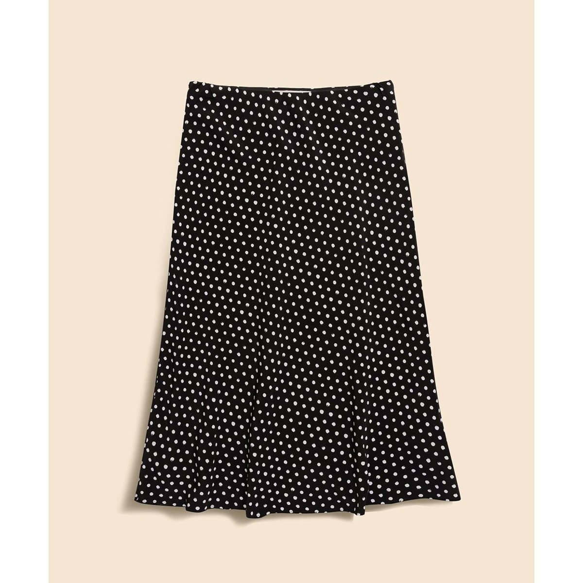 クラシックモダンなポルカドット柄のスカート。肌寒い季節にはボリュームのあるセーターやブーツを添えて暖かみのあるスタイルに、暖かな季節にはTシャツやサンダルで軽快にと、一年を通してご着用いただけます。ドットを手描きで表現することでひとつひとつに柔らかなニュアンスが宿り、モノトーンパターンでありながら、ひと匙の遊び心と愛らしさが感じられます。どんなシーンにもシックに映える滑らかなビスコース素材を使用し、上品な雰囲気に仕上げました。オンオフをシームレスに繋ぐ、頼れる一着です。