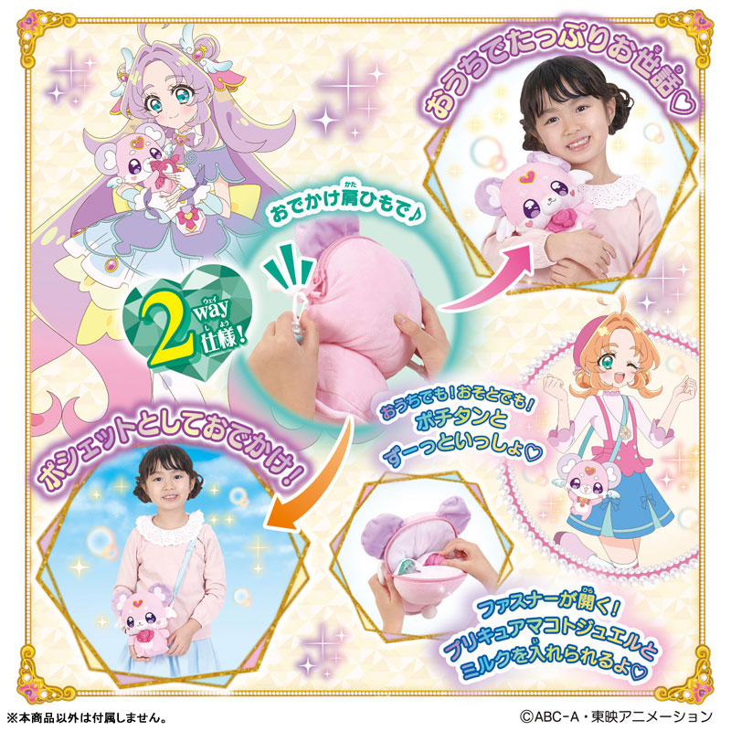 おでかけ肩ひもを付け替えて、おうちでお世話とポシェットの2wayで遊べる、ポチタンのおしゃべりぬいぐるみです。プリキュアマコトジュエルを個別検出し、セットした回数に応じてポチタンのおしゃべり内容が3段階に成長します。なでなでお世話と、付属のミルクを用いたミルクお世話でも遊べます。