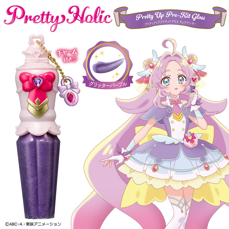 アニメ本編に登場する探偵道具「プリキット」のリップグロスです。 プリキュアのイヤリングをモチーフにしたチャーム付き。 カラーはグリッターパープルです。 唇に塗布するとキラキラと輝きます。