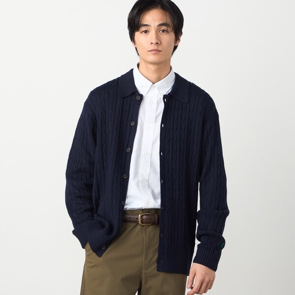 ミドルゲージ(7ゲージ)のケーブル柄衿付きカーディガンです。