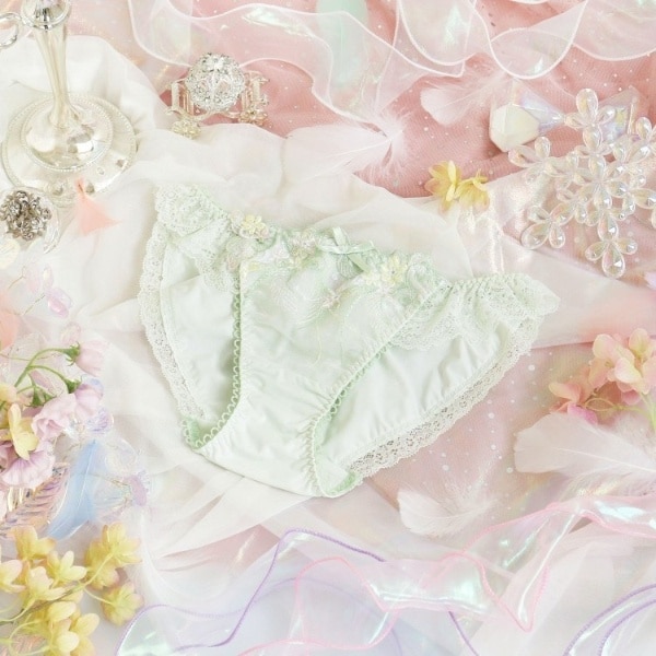 物語に登場する妖精「ティンカーベル」をモチーフにしたシリーズです。レースにはくるくると曲線を描く羽や、小花の刺繍を様々なステッチで散りばめて、ティンカーベルが軽やかに舞う様子を表現。色とりどりのオーロラ糸やマルチ糸を織り交ぜることで、妖精の光の粒子が放つ、夢のような輝きを演出します。サイドとバックスタイルにはお揃いのアップリケをあしらい、細部まで華やかな印象に。光の角度によって表情を変える繊細なきらめきが、身に着けるだけでときめきの魔法をかける、ロマンティックなコレクションです。