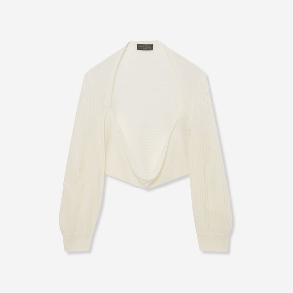 透け感のある縞の編地の長袖のマーガレットボレロです。筒状のニットの中央が開いており腕を通すことができます。ショート丈ですっきりした着こなしになりワンピースやボリュームのあるボトムス合わせに便利です。超細番手の綿をポリエステルとカバーリングした素材で、清涼感とシャリ味をもち軽く肌離れも良く、暑い時期にも着やすくなっています。リブ袖を内側にたくし上げ、短めのバルーン袖のようにアレンジもできます。着ない時は帯状になっており、コンパクトさや畳みやすさも魅力です。