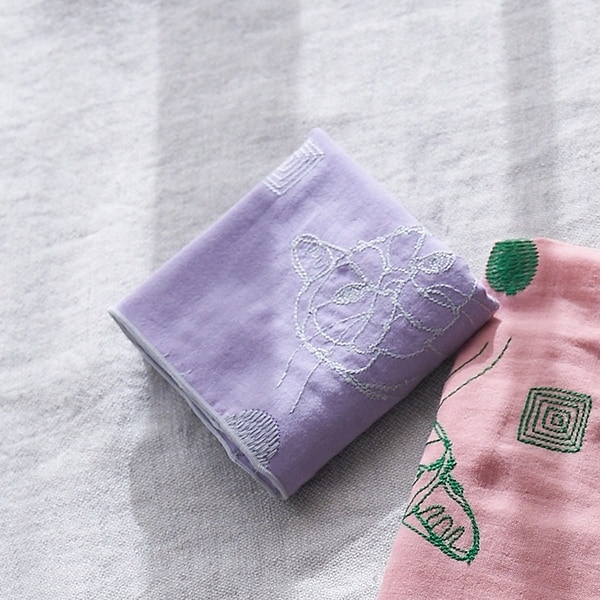 ワイヤーアート作家「+HAyU」の猫モチーフを、やわらかい綿100%ダブルガーゼに刺繍で表現したハンカチ。