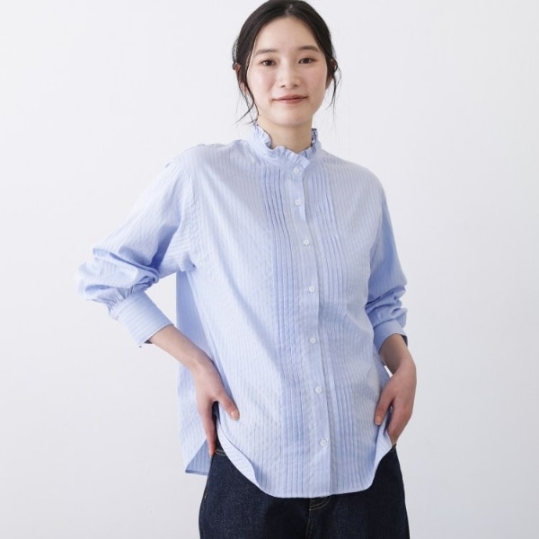 フリルネックとフロントの繊細なタックデザインが、顔まわりを華やかに見せてくれます。