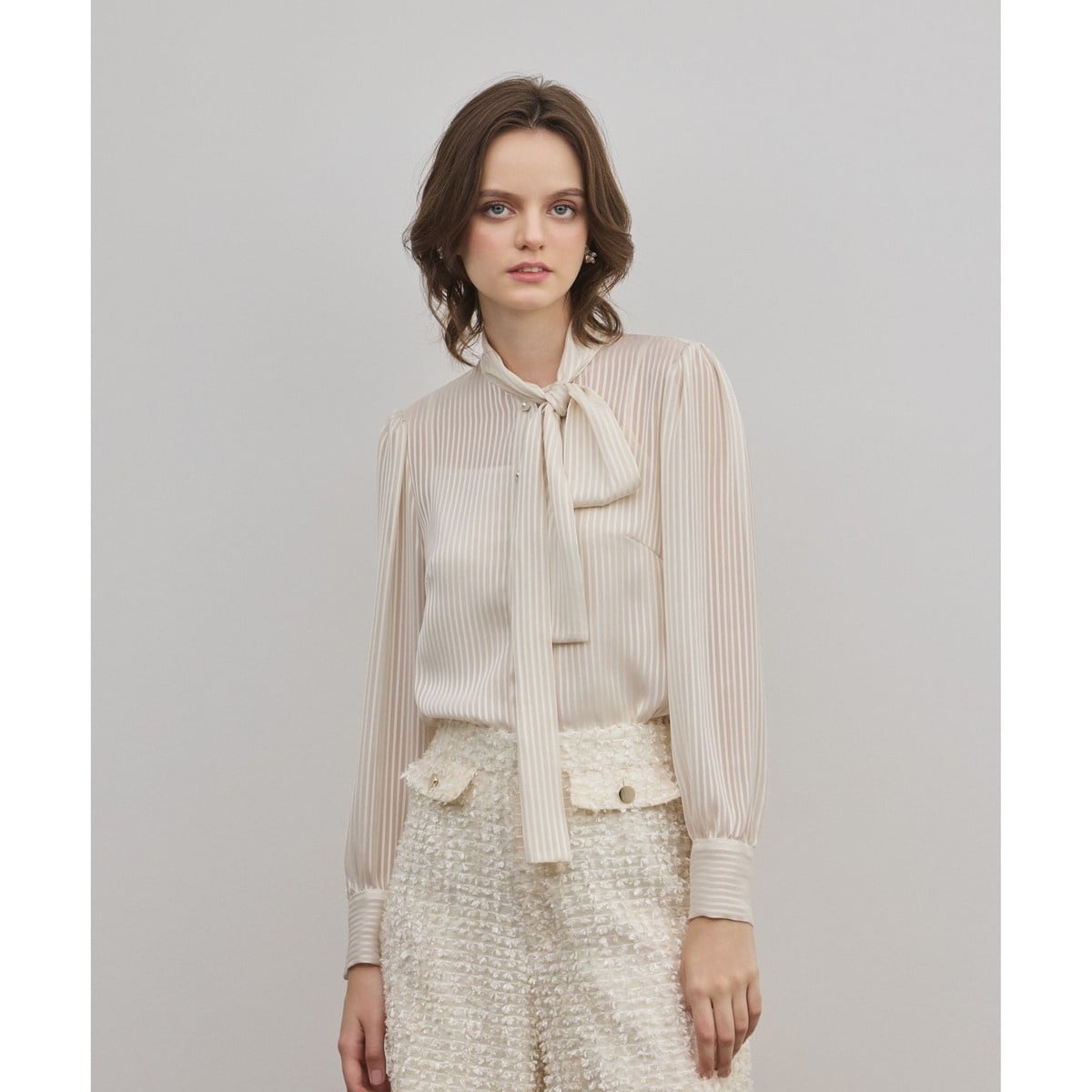 サテン部分とシフォン部分がある織でストライプを表現した素材のブラウス。透け感のある素材と衿のボウタイが華やかさのあるデザイン。ジャケット等のインナーに使用して華やかなスタイリングになります。