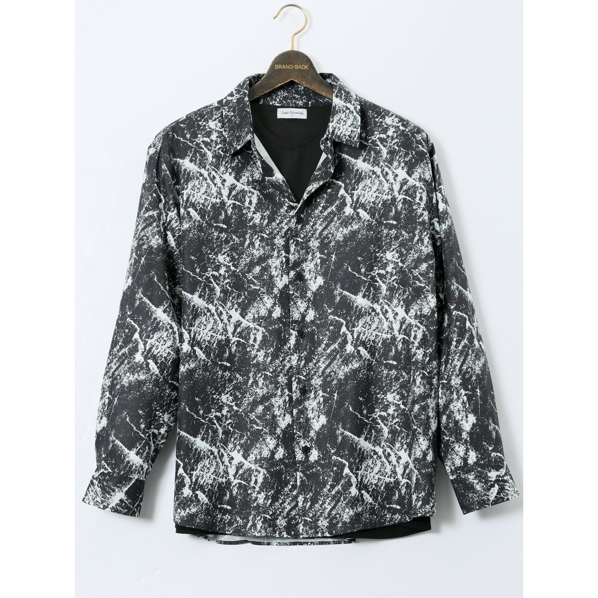 レギュラーカラー長袖シャツとVネック半袖Tシャツのアンサンブルです。モノトーンを基調にた総柄プリントでモードな雰囲気に仕上げています。お洒落なレイヤードスタイルが簡単に完成する、うれしいセット企画。2枚セットで着るのはもちろん単品としても着回し可能です。