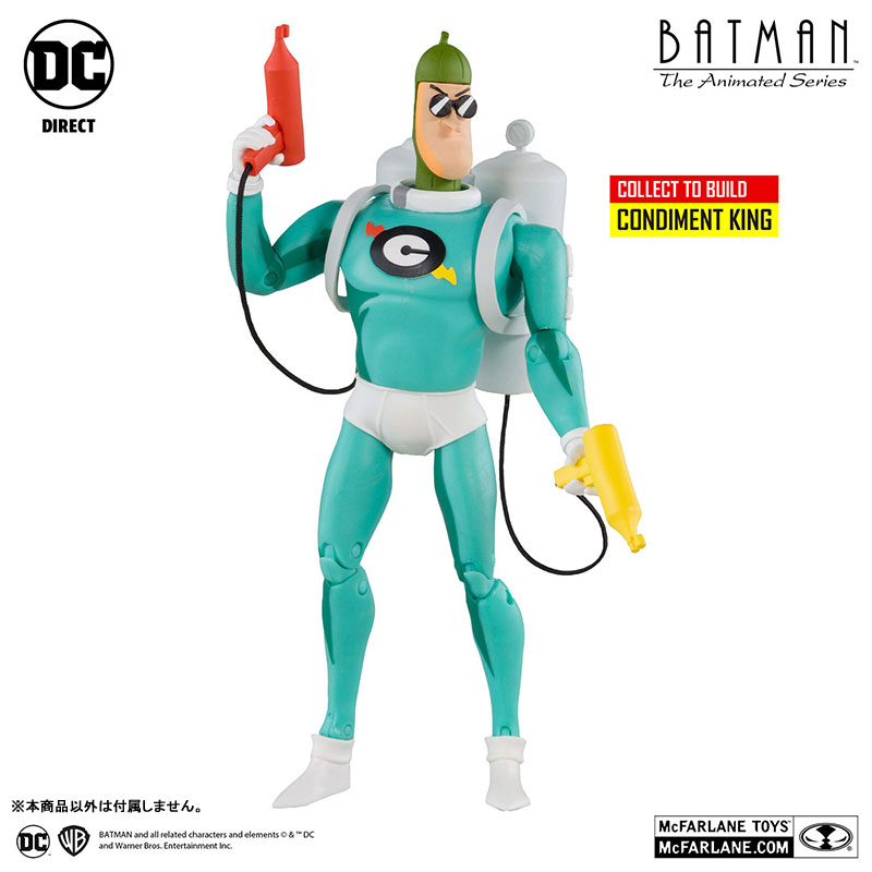 さらに、同シリーズのバットマン、ロビン(別売り)、スケアクロウ(別売り)、ミスター・フリーズ(別売り)の各フィギュアに付属されるビルドアップパーツをすべて揃えると、コンディメント・キングが完成するぞ!