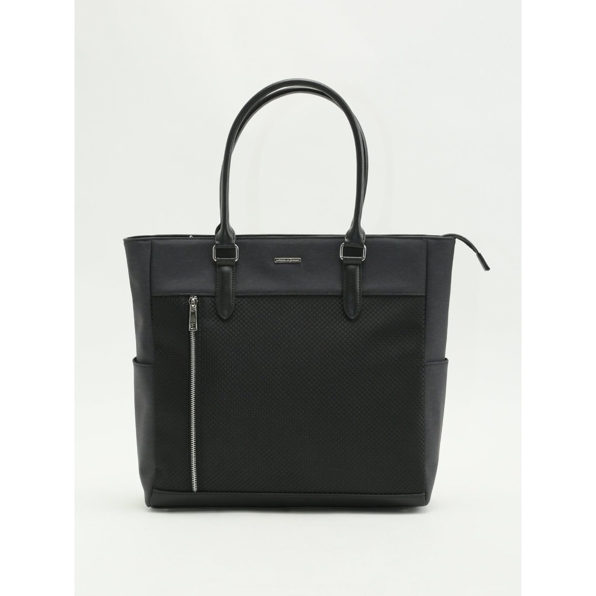 異素材をバランス良く組み合わせたトートバッグです。メイン収納は中身の飛び出し防止や防犯面も安心な天ファスナー仕様。内部にはPCやタブレットの持ち運びに安心のクッション入りポケット、小物収納に便利なマルチポケット、ペットボトルホルダーを搭載。外側には手帳やスマホの収納に便利な縦型のファスナーポケット、サイドにはマイボトルや傘などの収納に便利なオープンポケット付き。握りやすい丸手ハンドルは肩掛けにも対応する長さに設定しています。