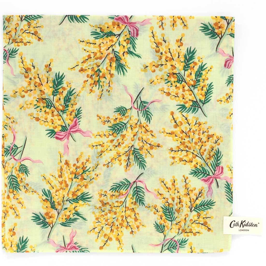 イエローが目を惹くミモザ柄の、しゃっきりとしたコットン生地を使用した、プリントタグが目印のハンカチーフです。