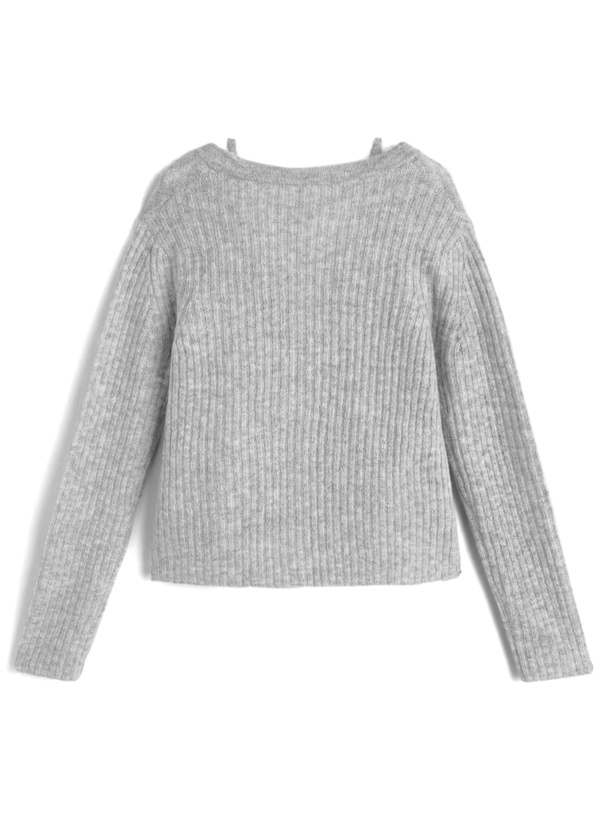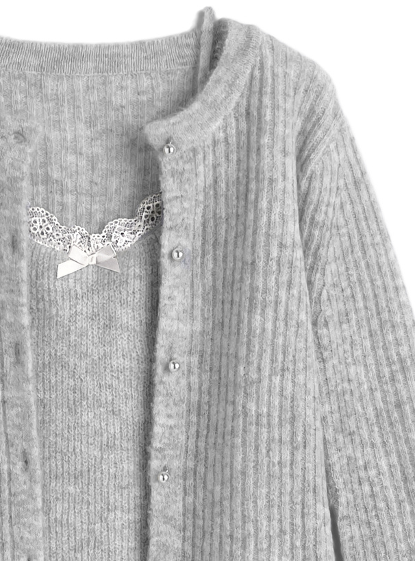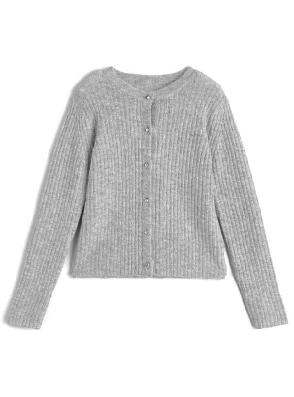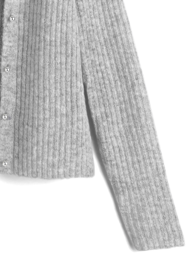 カーディガンは凹凸感を出したリブ編みが縦のラインを強調し、すっきりとしたシルエットを演出。