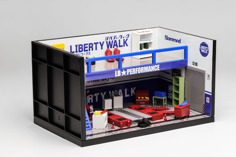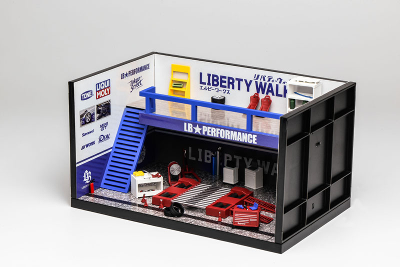 LB PERFORMANCEのロゴやサイン、ツール類、作業スペースまで細かく作り込まれており、ミニカーを置くだけで本格的なガレージシーンを演出できます。