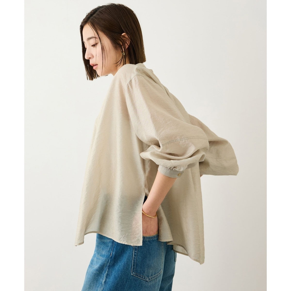 顔周りを端正に見せるスタンドカラーと、たっぷりとしたボリューム袖が、洗練された女性らしさを演出します。