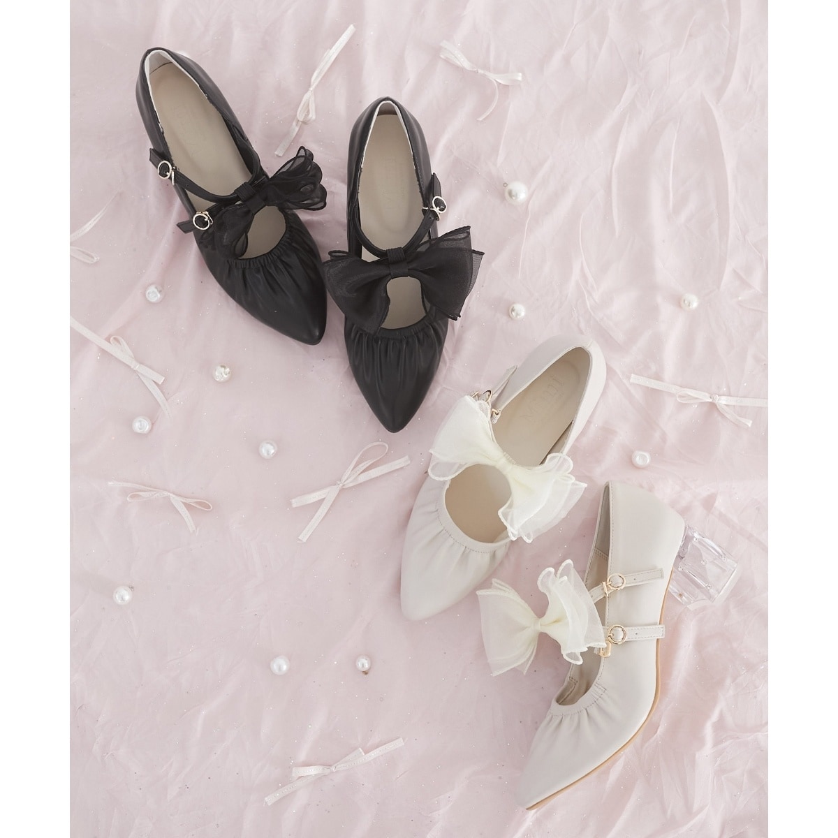 透け感のある映えリボンと、光を受けてきらめくキラキラヒールが目を惹くストラップパンプス。