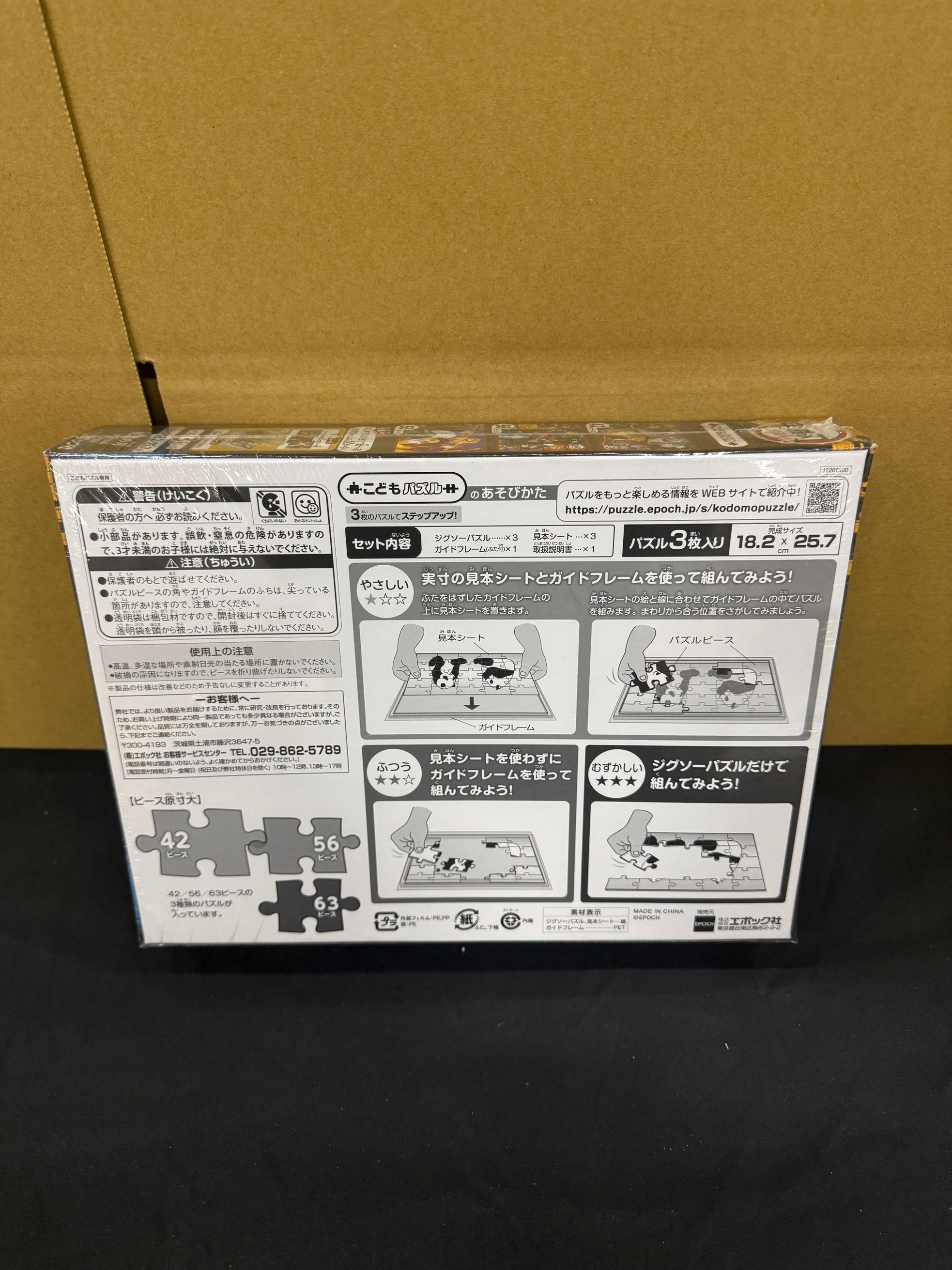 42ピース、56ピース、63ピースの3種類のパズルが入っており、完成サイズは18.2×25.7cmです。