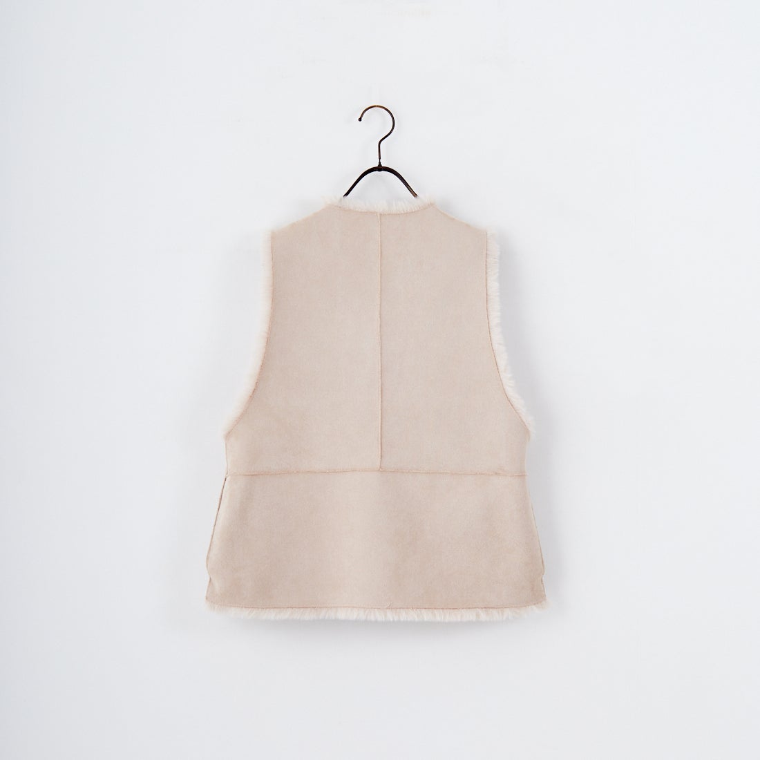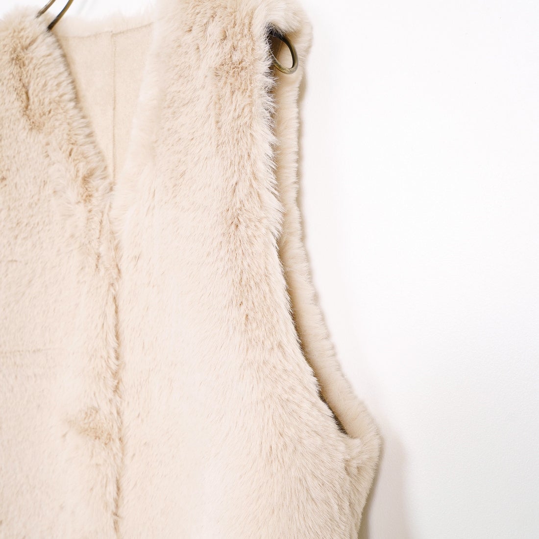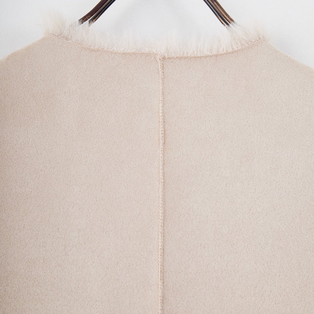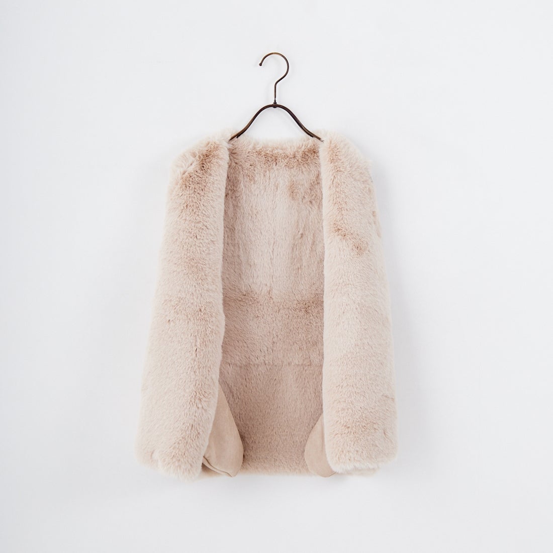 ふんわりとしたファーで程よくボリューム感があり、今年らしいスタイリングにマッチするファーベスト。裏面はフェイクスエードのリバーシブル仕様でカジュアル感を出したいときにおすすめです。スカートからパンツまで幅広くバランスを取りやすいデザインで、一枚羽織るだけでトレンドライクなスタイリングに仕上がります。合わせるインナーによっても雰囲気を変えらるので様々なコーディネートに活躍するアイテムです。