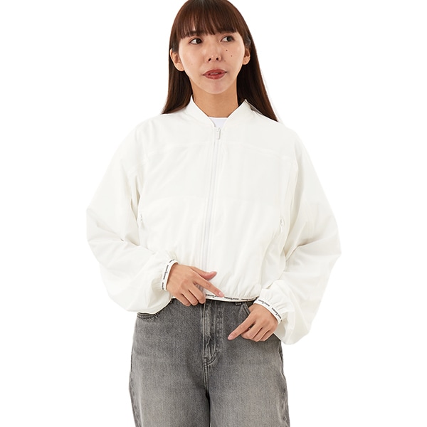 袖のボリューム感が際立つように、着丈を軽快なクロップド丈にしたボンバージャケット。ほどよく薄手で軽いポリエステル素材は、高いストレッチ性で動きやすさも抜群です。袖口と裾はロゴ入りテープのバインダー仕様にしてアクセントに。フロントには中身の落下を防ぐファスナーポケット付きです。バックスタイルのワッペンも見逃せません。