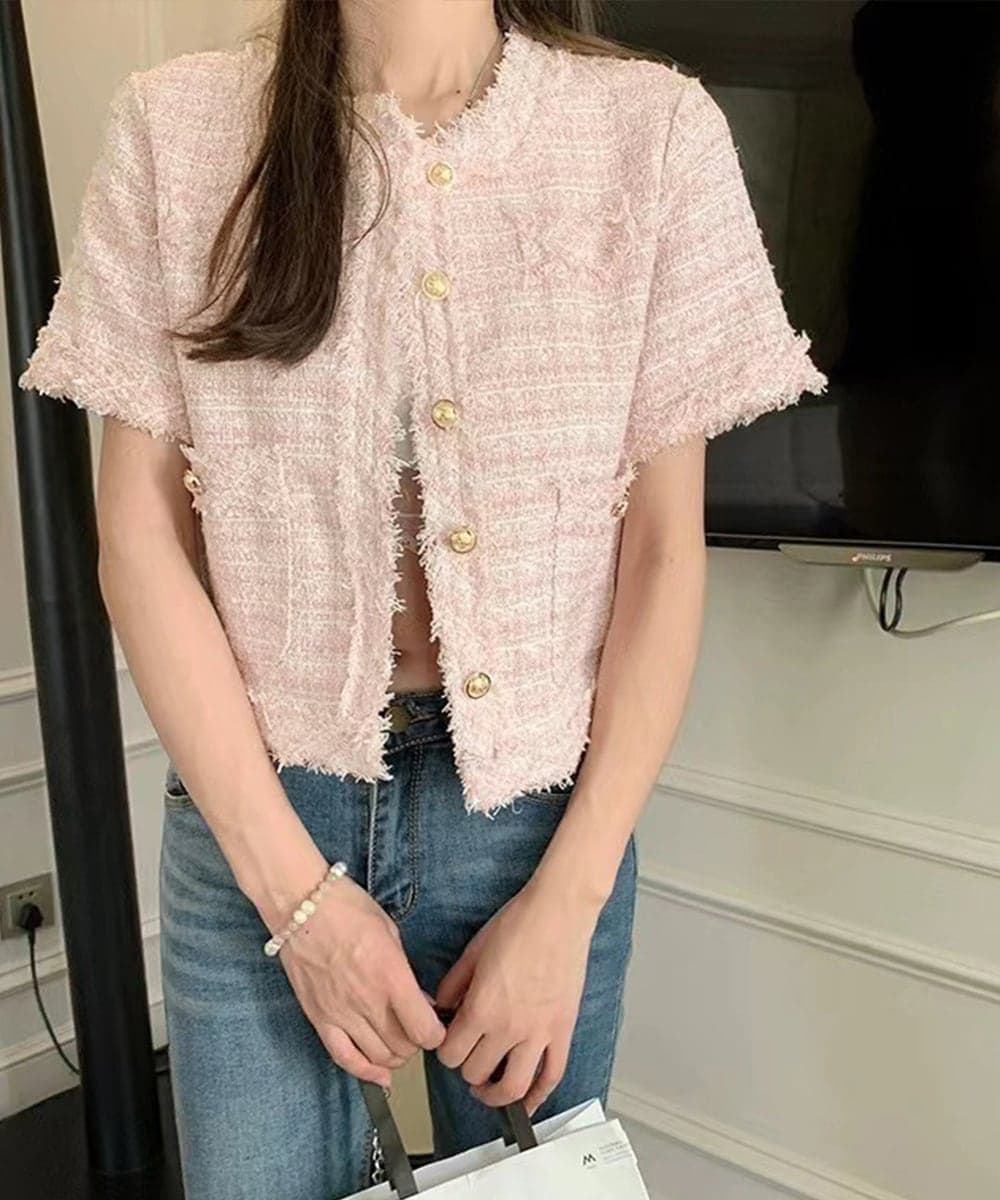 上品な雰囲気を纏える、ツイード風の半袖ノーカラージャケット。