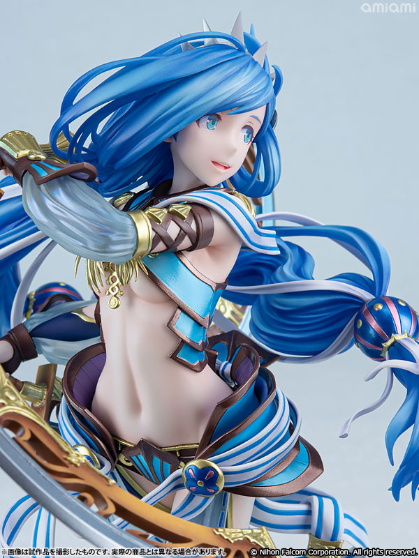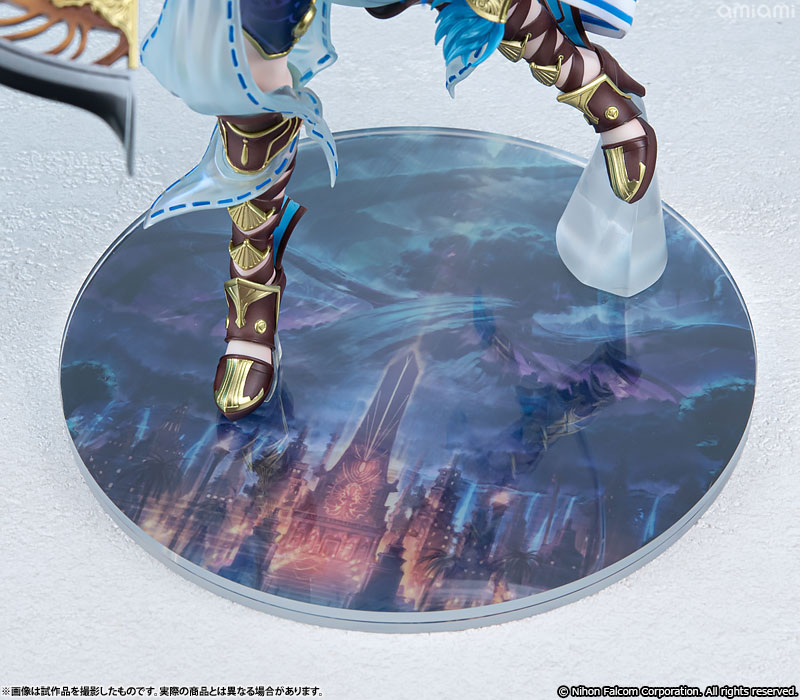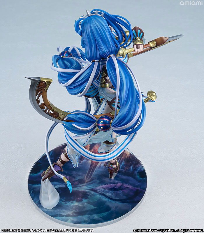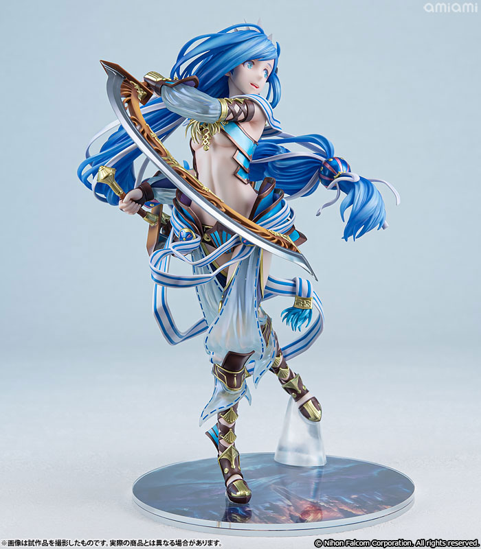 特徴的な蒼髪を大胆にはためかせ、両手には半月刀「クレシェント」を持った姿は大迫力ながら神秘さも漂う一品。