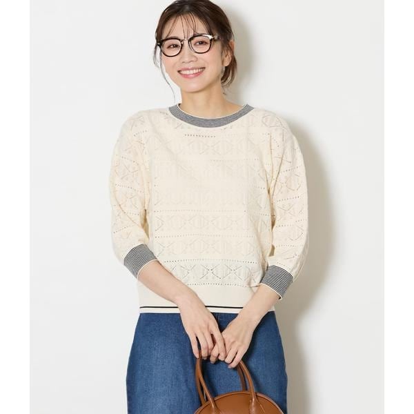 クロッシェ編み風の透かし柄が印象的なドルマンプルオーバー。ミジンボーダーのリブがアクセントになり、さりげなく引き締めた印象に。程よいゆとりのあるシルエットと、ややコンパクトな着丈で、ワイドパンツやスカートなどボリュームのあるボトムとも好相性です。