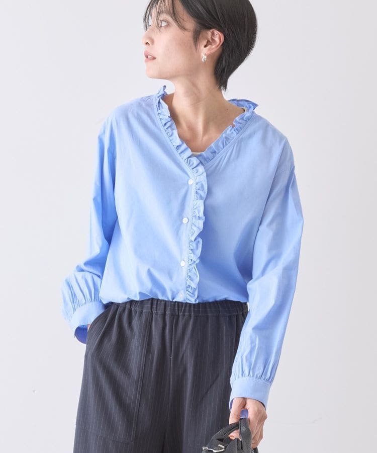 さりげないフリルで、毎日を上品カジュアルに首元をすっきり見せるVネックに、控えめなフリルをプラスしたデザインです。顔まわりが明るく見え、自然と女性らしい印象に仕上がります。全体はゆとりのあるシルエットで、長時間着ても窮屈感が少なく快適です。袖口のギャザーが動くたびにやわらかなニュアンスを生み、シンプルな中にも表情を感じられます。パンツスタイルと合わせればすっきりとした印象に、スカートと合わせればやさしい雰囲気を楽しめます。デイリー使いからちょっとしたお出かけまで幅広く活躍し、着回し力の高さも魅力です。大人の余裕を感じさせる一枚です。透け感[なし]