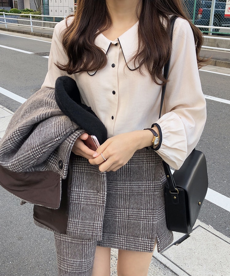 配色ラインが映える、大人可愛いピーターパン襟ブラウス。