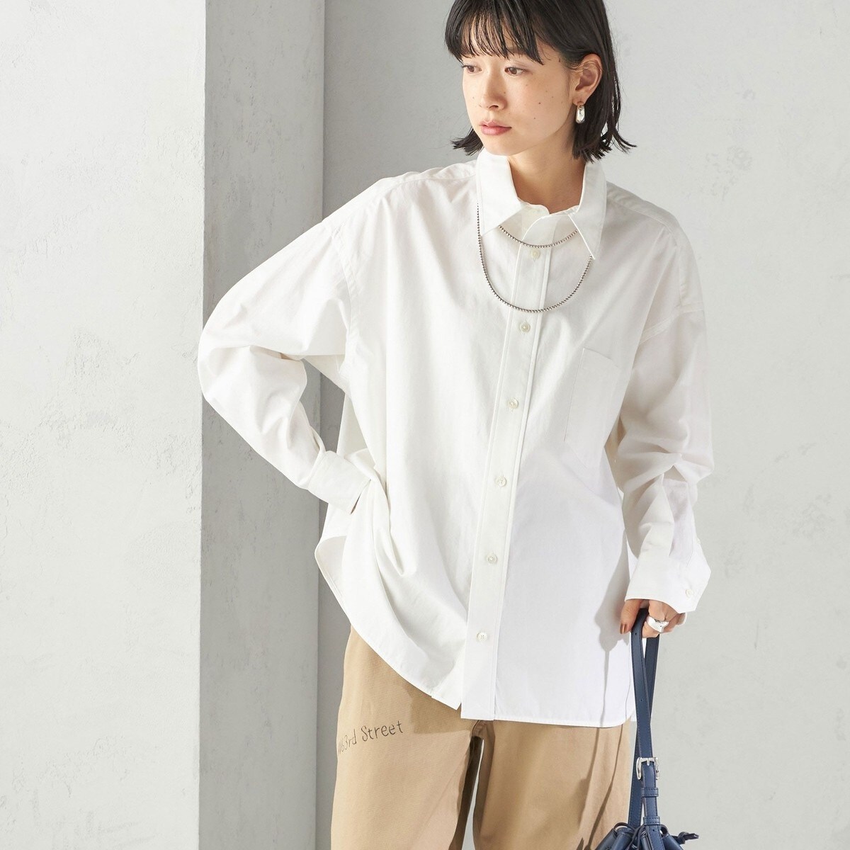 ゆったりとしたボクシーシルエットに映える大きめの襟が、程よい存在感を演出。